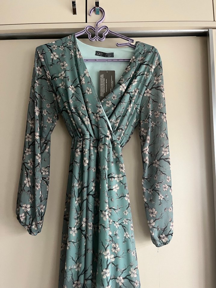 Bu uzun yeşil elbise V yakalı, uzun kollu ve bol kesimdir. Drapeli detayları ve çiçekli baskı deseni ile bohem tarzda günlük kullanıma uygundur.