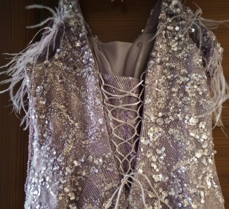 Bu uzun, v yaka ve askılı kadın elbise dantel ve işleme detaylarıyla süslenmiştir. Bohem tarzda, düğünler için şık ve göz alıcıdır.