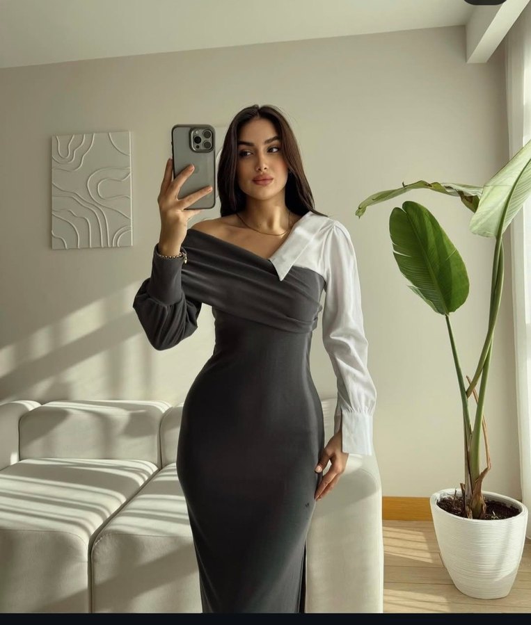 Uzun gri elbise, V yaka ve uzun kollu, drapeli tasarıma sahiptir. Sentetik kumaşıyla ofis ortamına uygun çağdaş bir kesim sunar.