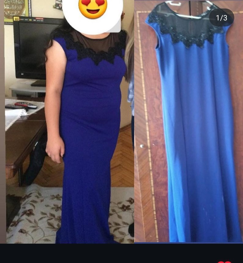 Uzun ve vücuda oturan lacivert abiye, V yaka ve kolsuz. Yakada siyah dantel transparan detay ve drapeli tasarım bulunur. Düğün ve özel günler için uygun. 42-46 beden.
