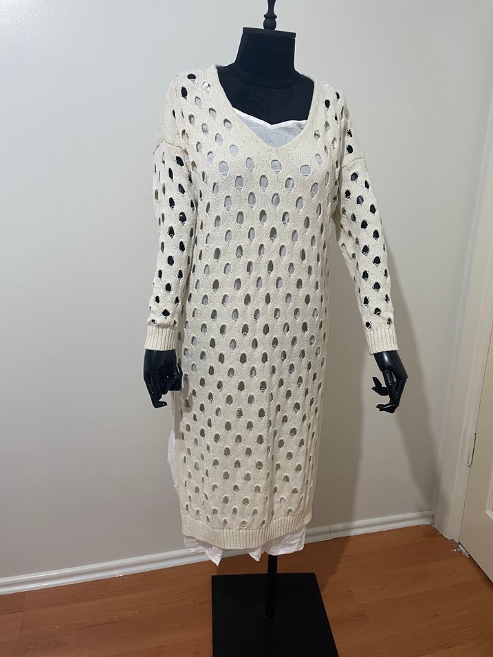 Uzun, bol kesim kadın kazağı V yakalı ve örme dokulu olup, beyaz renkte rahat ve bohem bir tarz sunar. Günlük kullanıma uygundur. Hiç kullanılmadı