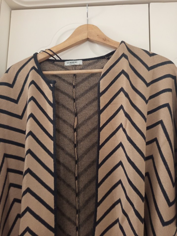 Uzun, örme kadın hırka, V yaka ve rahat kesime sahiptir. Uzun kollu olup kahverengi ve gri zikzak deseni taşır.