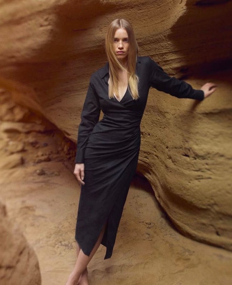 Uzun siyah keten elbise, V yaka ve uzun kollu, drapeli tasarımıyla ofis için uygun, regular fit ve gotik tarzda. Sadece 1 defa giyildi.
