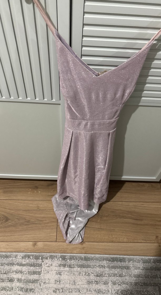 V yaka, drapeli tasarıma sahip uzun ve kolsuz abiye elbise. Parlak mor-gri kumaşıyla şık bir görünüm sunar, düğünler için uygundur. ✨
