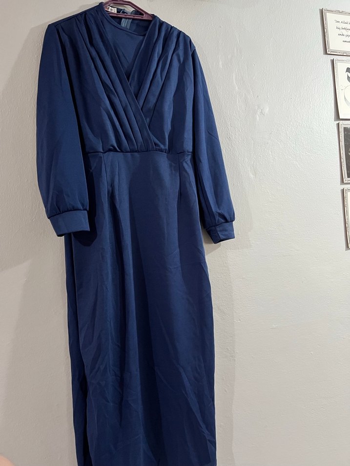 Kadınlar için uzun, V yakalı, drapeli ve bol kesim elbise. Sentetik kumaştan yapılmış koyu mavi renkte, sade ve minimal tarzda günlük kullanıma uygun. 2 beden 42 bedene de uyar