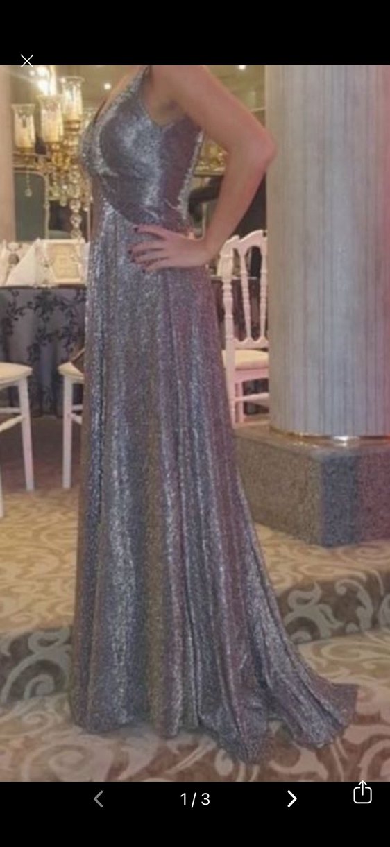 Uzun, drapeli ve V yakalı bu abiye elbise, ince kesimi ve askılı kollarıyla şık bir görünüm sunar. Parlak gri kumaşı düğün ve özel davetler için uygundur. S beden uygundur