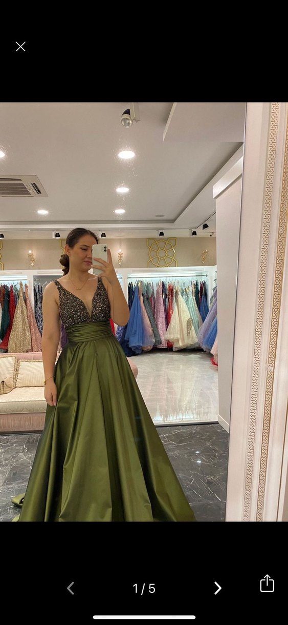 Uzun, v yakalı, kolsuz haki abiye elbise, parlak kumaş ve drapeli bol kesimle klasik şıklığı yansıtıyor. Düğün ve özel davetler için uygundur. ✨