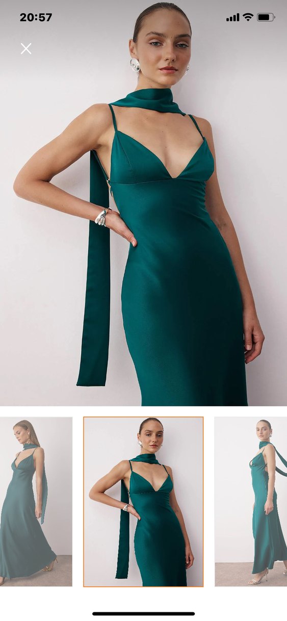 V yaka, ince askılı, saten ve parlak turkuaz uzun elbise. Drapeli detaylarıyla şık ve iddialı, düğün gibi özel anlar için uygundur.