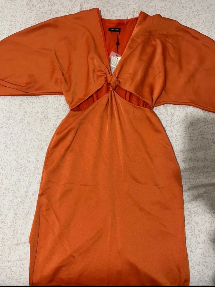 V yakalı, uzun kollu ve drapeli tasarıma sahip, vücuda oturan uzun elbise. İpeksi kumaştan, parlak turuncu renkte, romantik akşamlar için ideal.✨ Etiketi üzerinde gögüs ve karın dekoltesi var arkadı da yırtmaçlı. İçi astarlı