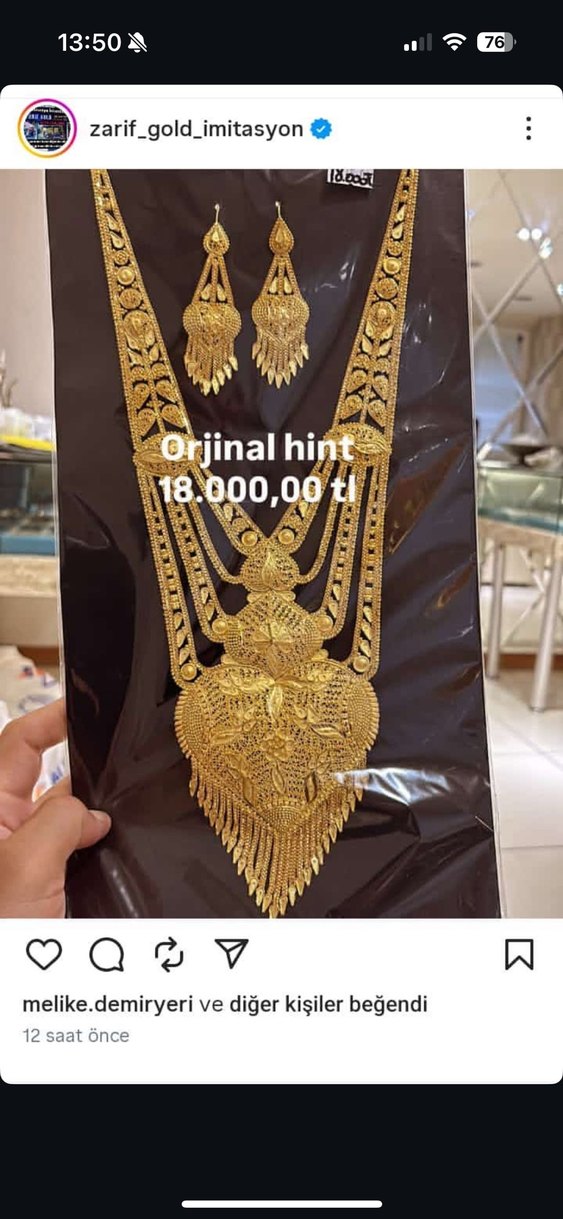 Uzun boyda, zincir detaylı, parlak altın renkli kadın kolyesi. Geleneksel Hint desenli, bohem tarzda, düğün için uygun. Orijinal Hint tasarımı, 18.000,00 TL fiyatlı.