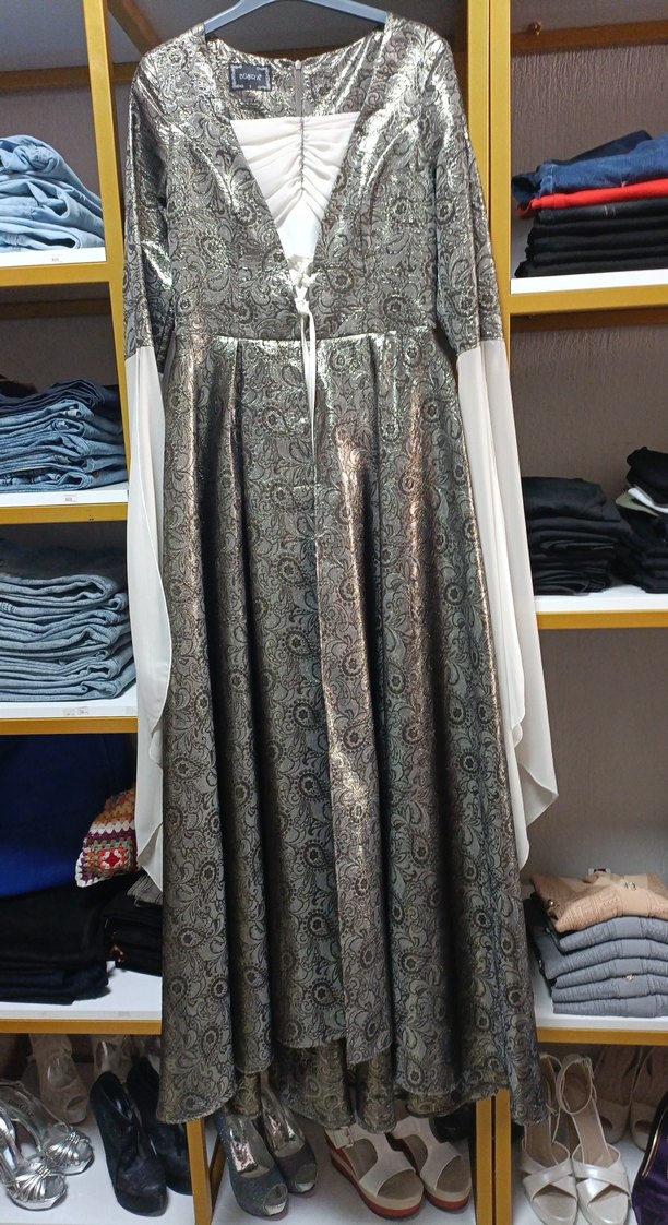 Bu uzun gri elbise, bol kesim ve drapeli tasarım ile V yakaya sahiptir. Sentetik kumaştan yapılmış, vintage batik desenli ve kolsuzdur, düğünler için uygundur.