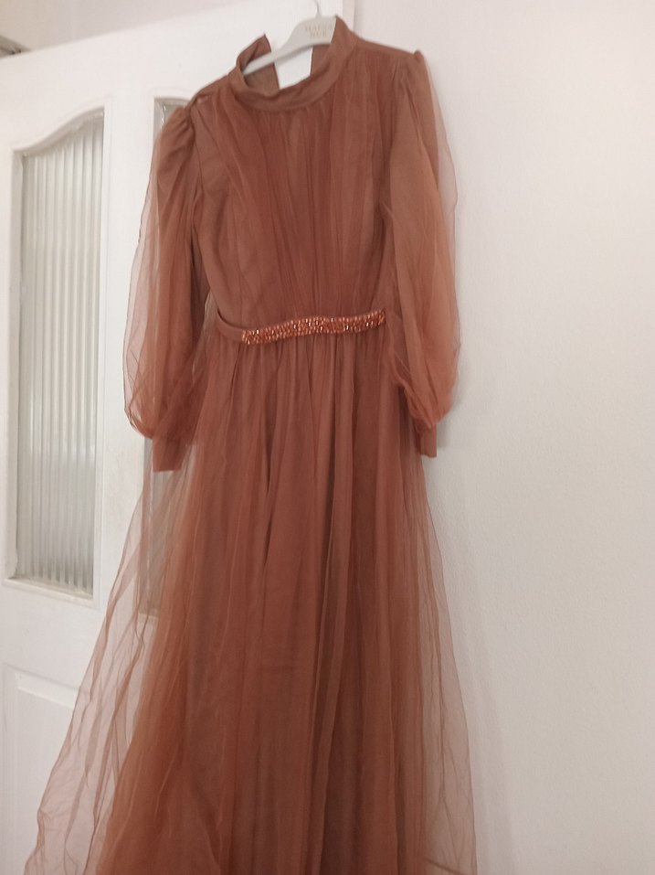 Uzun, vücuda oturan vintage tarzda drapeli kadın abiye elbise. Şeffaf uzun kollu, yüksek yakalı ve ince kemer detaylıdır. Düğün için uygundur. 36 beden ama ben terziye verip 38-40 beden yaptım terzide yapıldığı belli olmuyor ona göre alım yapabilirsiniz