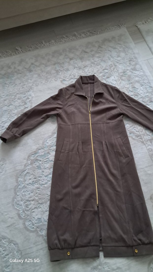 Uzun vizonrengi kaban, fermuarlı ön, kesilmiş yaka ve uzun kollu. Rahat kesim, minimalist ve desen içermeyen tarzıyla günlük kullanıma uygun.