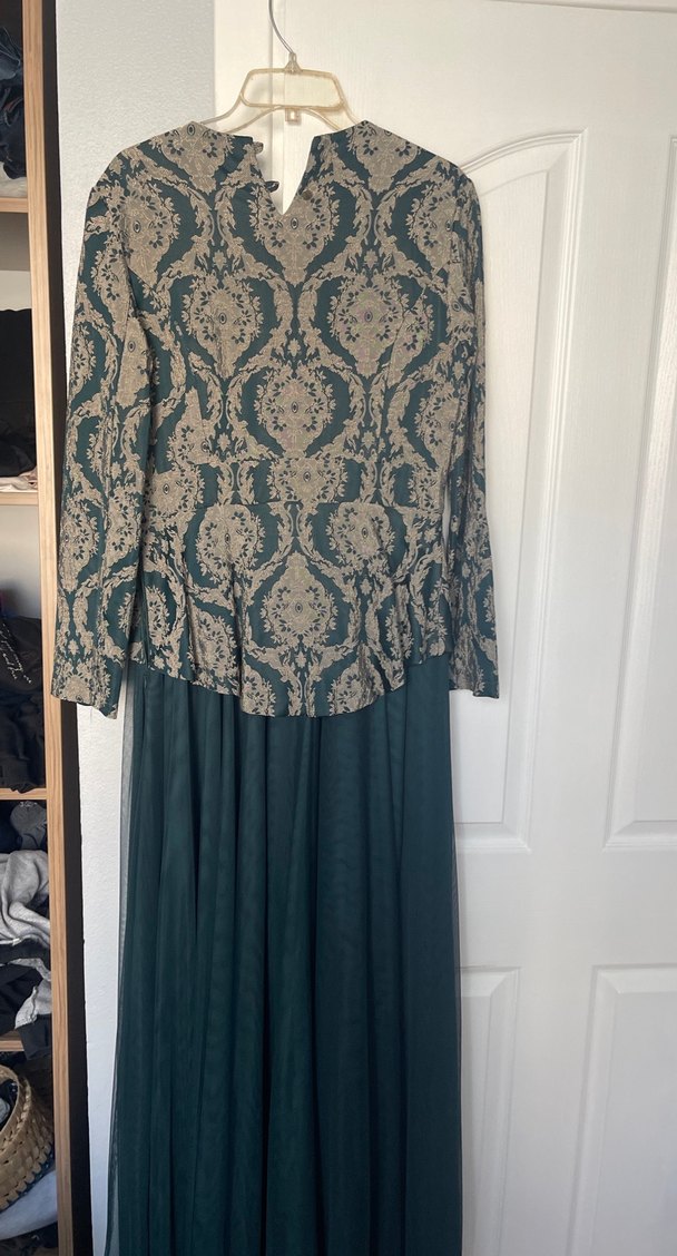 Uzun yeşil elbise, yüksek yaka ve uzun kollu.dökümlü abiye 40 beden yazıyor ama büyük kalıp 42 beden rahat lıkla kullanır