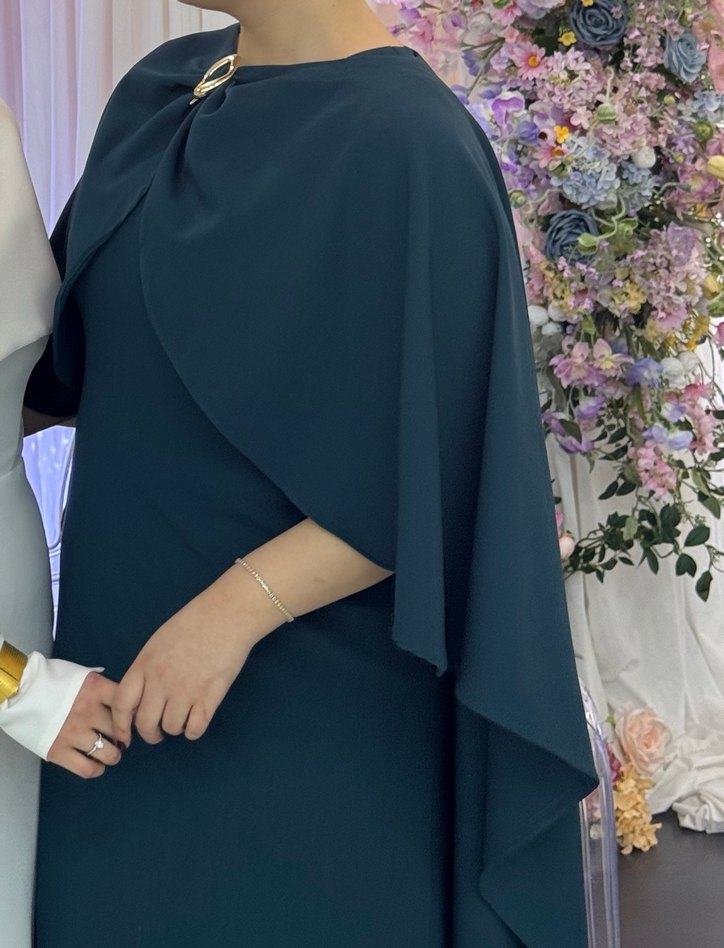 Uzun yeşil abiye elbise,Pelerinli ve drapeli tasarımı ile şık bir görünüm sunar. Düğünler için uygun, modest ve klasik tarzda, sadece 1 gece kullanıldı özel dikimdir 42 - - 46 beden uyumludur