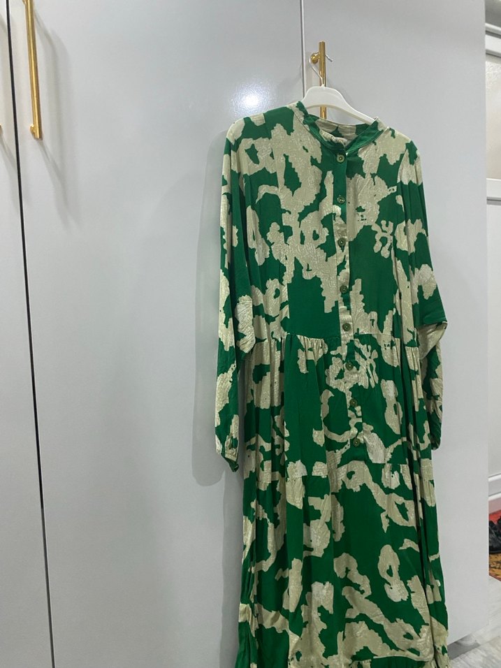 Uzun, koyu yeşil bağlama desenli, bol kesim ve drapeli tasarıma sahip elbise. Uzun kollu ve yüksek yakalı, yumuşak sentetik kumaştan üretilmiştir. Bir kaç kez giyildi