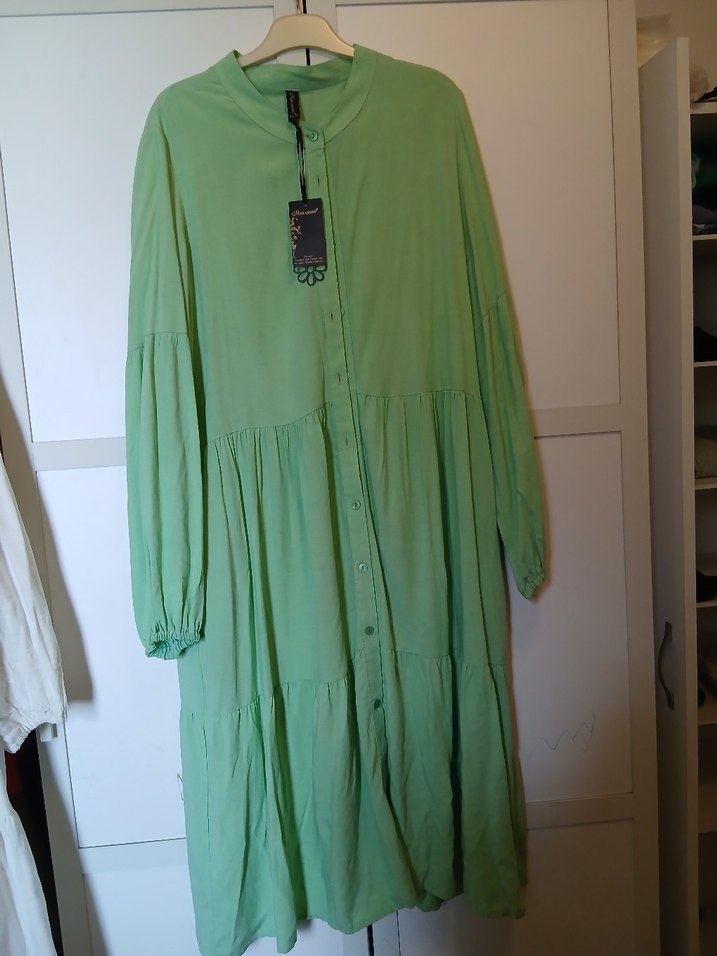 Yumuşak keten kumaştan, uzun kollu ve düğmeli, bol kesim uzun yeşil elbise. Bohem tarzına uygun, yuvarlak yakalı ve desensiz. göğüs 55.boy.1.20.