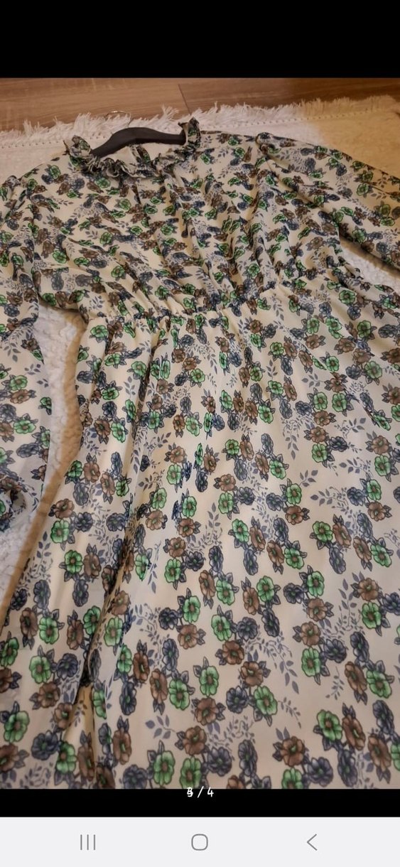 Uzun, yeşil kadın elbisesi, bol kesim, uzun kollu ve V yaka detaylıdır. Yumuşak sentetik kumaştan, drapeli ve hafif çiçek desenlidir, bohem tarzını yansıtır.