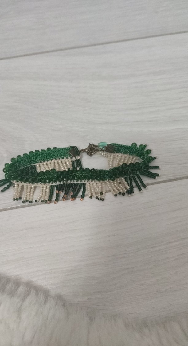 Uzun yeşil boncuklarla süslenmiş, yılan desenli bohem tarzda günlük kullanıma uygun kolye.