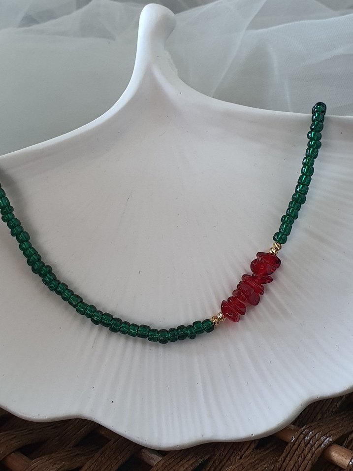 Uzun yeşil boncuklardan oluşan, ortasında kırmızı boncuk detaylı, minimalist bohem tarzda romantik akşamlar için uygun kolye.
