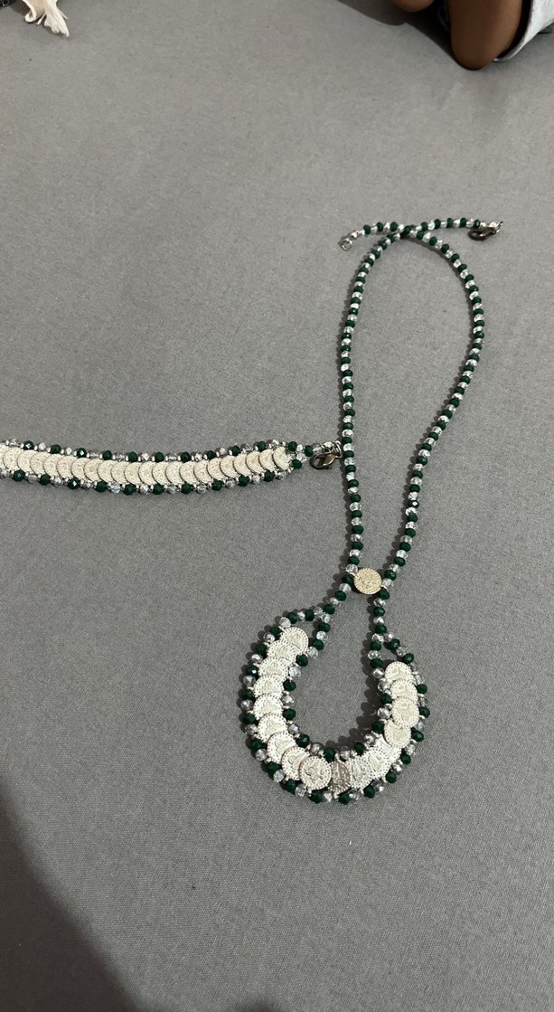 Uzun yeşil boncuklarla çevrili yılan desenli kolye, bohem ve avangart tarzı yansıtır, günlük kullanıma uygundur. El emeği