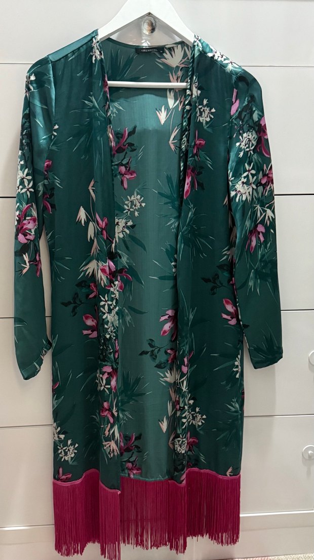Uzun ve bol kesim, koyu yeşil çiçek desenli kimono. Uzun kollu, V yakalı, yumuşak sentetik kumaştan yapılmış, günlük kullanıma uygun.