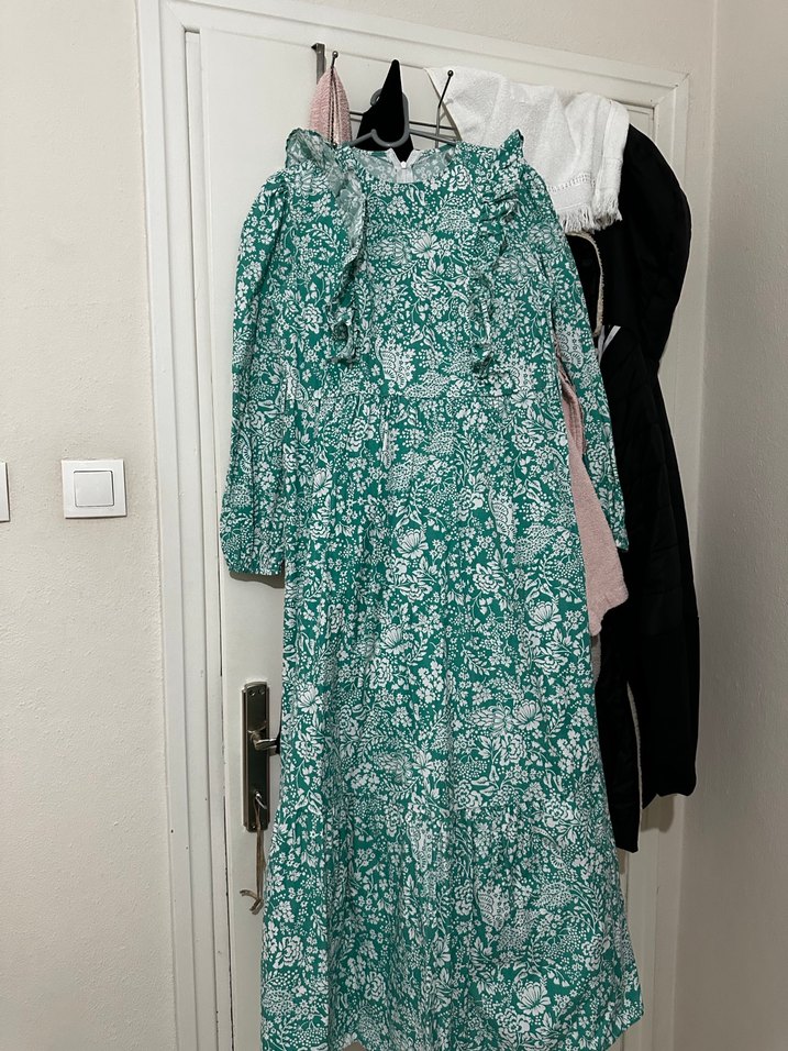 Uzun kollu, bol kesim ve drapeli tasarıma sahip açık yeşil desenli bohem elbise, günlük kullanım için uygundur. 2 kere giyildi