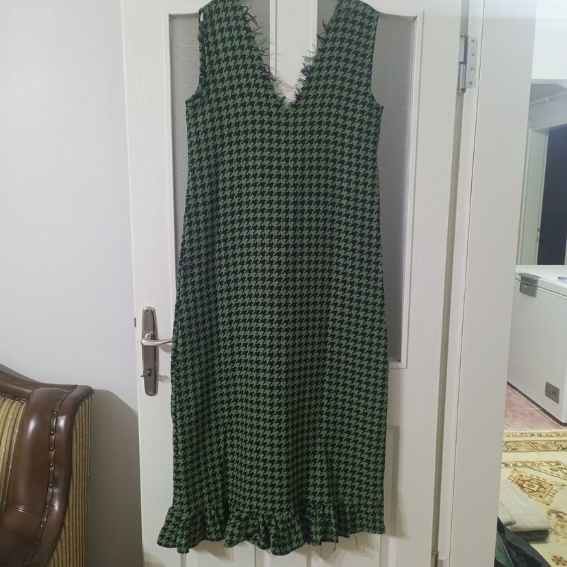 Uzun yeşil jile, koyu kazayağı desenli, rahat ve retro sokak stili ile bohem tarzı sunar.