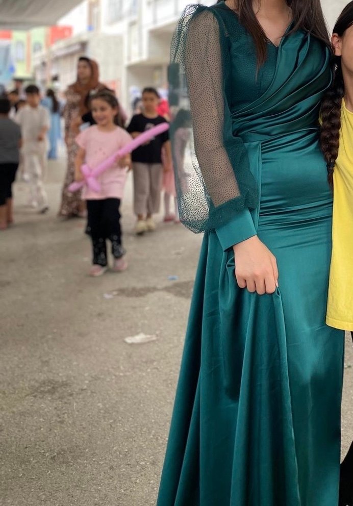 Vücuda oturan uzun abiye elbise, drapeli detaylara, tekne yakaya ve tül görünümlü uzun kollara sahiptir. Parlak yeşil rengi ve modern klasik tarzıyla düğünler için uygundur. 36 bedene uyumludur