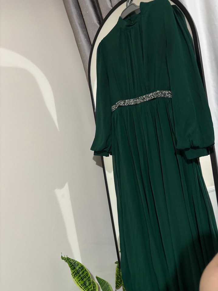 Uzun yeşil abiye elbise, yüksek yaka ve bol kesim ile drapeli detaylara sahiptir. Parlak kumaşı ve ince bele oturan süsü ile düğünler için uygundur. Strappy kolludur.