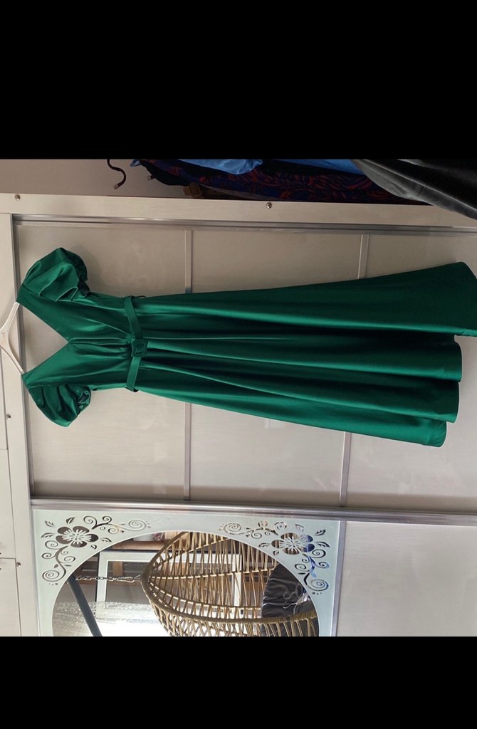 Bu uzun ve dar kesim abiye elbise, parlak yeşil kumaş, drapeli tasarım, askılı kollar ve V yaka ile düğünler için uygundur.