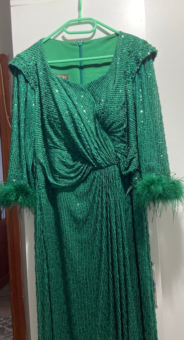 Uzun yeşil abiye elbise, bacak kısmında yırtmacı mevcuttur istenilse kapatılabilir.Elbise taş işlemelidir.Omzunda bazı taşlar eksiktir ama belli olmuyor.✨ (ihya dan alınmıştır )