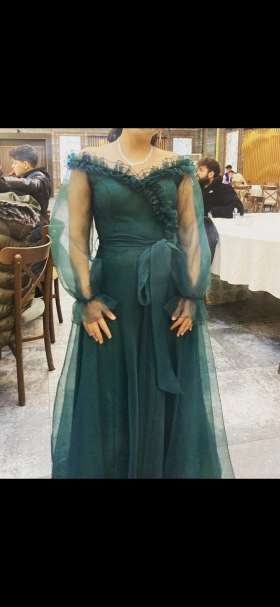 Uzun yeşil abiye, drapeli tasarım, tekne yaka ve uzun kolludur. Parlak, desenli kumaşıyla klasik ve bohem tarzı yansıtır.