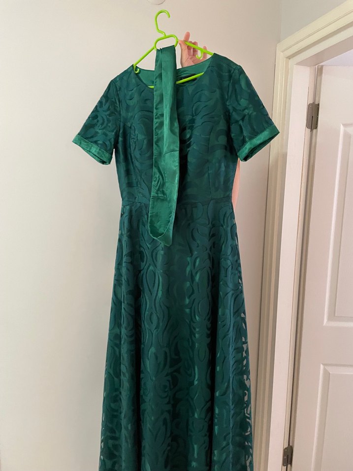 Uzun, yeşil ve parlak kumaştan yapılmış, vintage esintili bohem tarzda, kısa kollu ve yuvarlak yakalı kadın elbisesi. kemer detaylı 1 kere giyinildi
