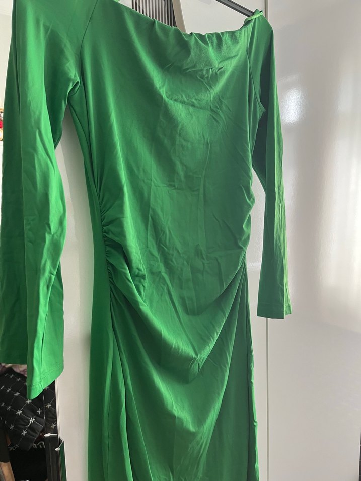 Drapeli uzun ve vücuda oturan yeşil elbise, tekne yaka ve uzun kolludur. Parlak ve ipeksi kumaştan üretilmiştir, parti için uygundur.