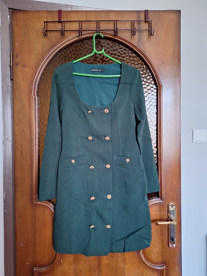 Uzun yeşil elbise, düğmeli ve kare yaka detaylıdır. Sentetik kumaştan üretilmiş ve uzun kolludur. İş ve günlük tarzlar için uygundur.