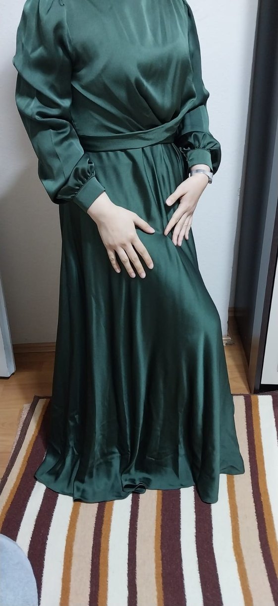 Uzun tesettüre uygun zümrüt yeşili elbise 40 beden önden bağlamalı kendinden kemerli bir elbisedir. Kollarıda düğmelidir. 1 kez giyildi.Hiç bir defosu ya da söküğü yoktur.