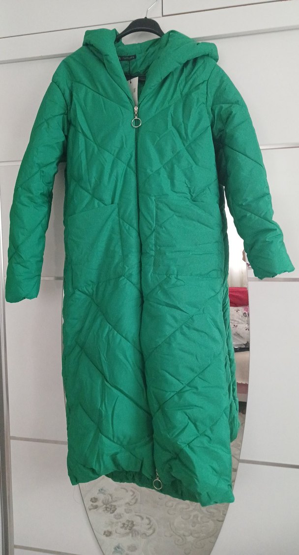 Bu uzun yeşil kışlık mont, fermuarlı ön kısmı ve vücuda oturan kesimi ile dikkat çeker. Yumuşak ve sıcak kumaştan yapılmış, uzun kollu ve kesik yaka detayına sahiptir.