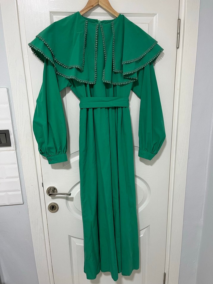 Bu uzun yeşil elbise, fırfırlı pelerin detayı ve yüksek yakaya sahiptir. Düğmeli manşetli uzun kollu, bol kesimdir ve işleme detaylı sentetik kumaştan üretilmiştir. Bohem tarzda, günlük kullanıma uygundur.