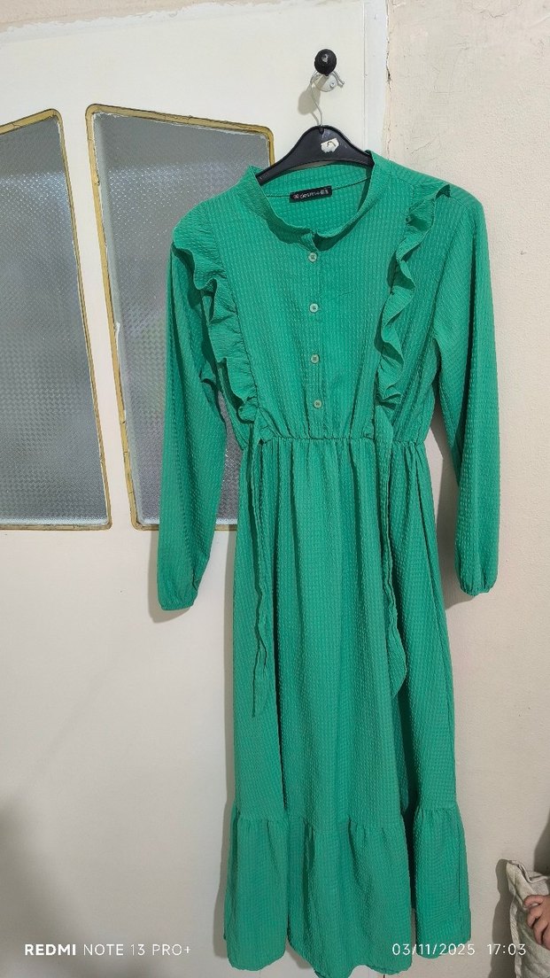 Uzun yeşil elbise, yüksek yakalı ve uzun kollu, fırfır detaylıdır. Yumuşak sentetik kumaştan, bol kesim ve renkli minimalist sokak stili için uygundur. iki kere giyildi dar olduğu için satıyorum kumaşı yumuşak ve çok rahat
