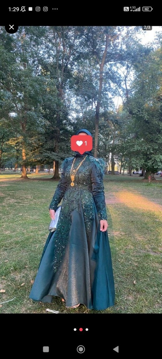 Yeşil renkte, etnik desenli, uzun kollu ve yüksek yakalı, drapeli, vücuda oturan uzun abiye elbise. Gotik ve sade tarzda düğün için uygun. ürün özel dikilmiştir bir kez kullanılmıştır herhangi bir sorun sıkıntısı yoktur esarbi hediyedir