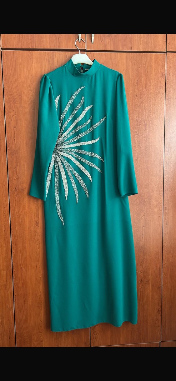 Yüksek yakalı, uzun kollu ve regular fit yeşil uzun elbise. İpek gibi kumaş ve parlak işlemeli detaylarla süslenmiştir, düğünler için uygun.