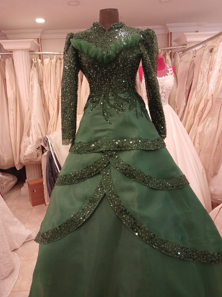 Uzun, yeşil işlemeli, yüksek yakalı ve uzun kollu bu düğün elbisesi, klasik ve zarif bir görünüm sunar.