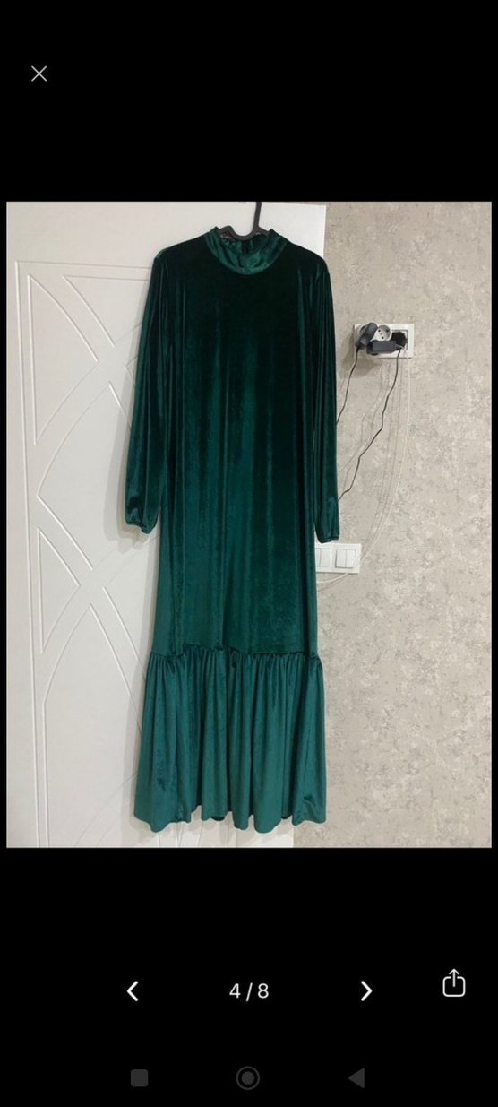 Bu uzun yeşil elbise, drapeli tasarımı, yüksek yakası ve uzun kollarıyla dikkat çeker. Yumuşak sentetik kumaştan yapılmış, bol kesimli ve bohem tarzda günlük kullanım için uygundur kısa olduğu için satılık 42 ve 44 bedene uygun