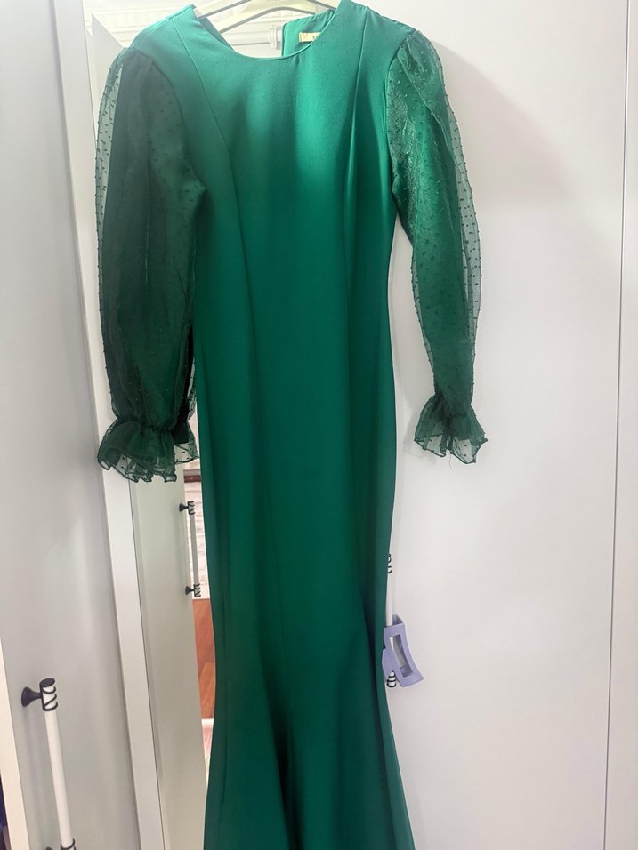 Dar kesim uzun yeşil abiye elbise, yuvarlak yaka ve tül uzun kollarıyla dikkat çeker. Drapeli tasarımı ve koyu yeşil rengiyle modern klasik bir görünüm sunar.