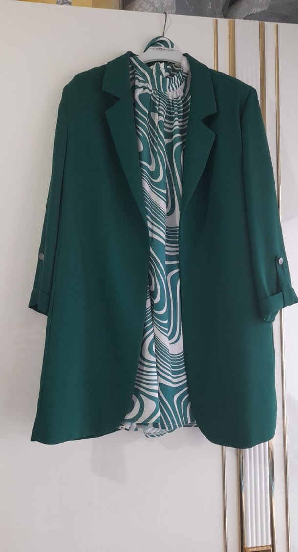 Uzun, yeşil kadın blazer ceket, kesik yakalı ve dökümlü tasarıma sahiptir. Düğmeli uzun kollu, regular fit ve parlak sentetik kumaftan üretilmiştir. Ofis için uygundur.