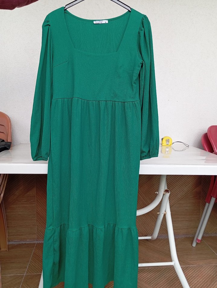 Uzun yeşil elbise, uzun kollu ve beli oturan kesime sahip. Pliseli detayları ve yuvarlak yakasıyla sade ve şık bir görünüm sunar.