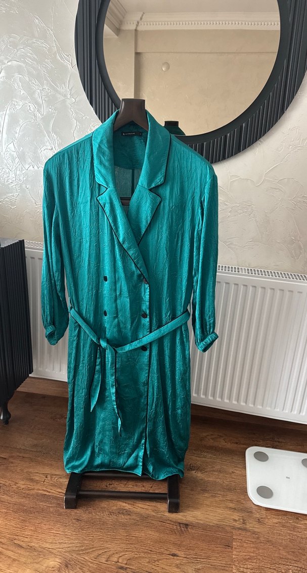 Uzun ve salaş kesime sahip, parlak turkuaz renkli kadın elbisesi. Uzun kollu, kemerli ve desen içermeyen sade bir tasarıma sahiptir. Kırışık saten kumaş 1 kere giydim hiç bir kusuru yok boyum 1.70 ayak bileğimin 4 parmak yukarısında kalıyor geçen sezon perspektif mağazasından alındı 38 beden ama 40 bedene de rahatlıkla olur. Renk mavi turkuaz çıkmış detaylılarda aslında ilk fotoğraftaki yeşil zümrüt renginde