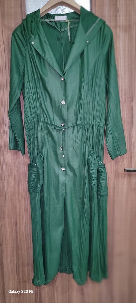 Uzun yeşil kadın yağmurluk, pileli tasarım ve kesik yakaya sahiptir. Keten kumaştan, bol kesimli, parlak ve desen içermeyen bohem tarzındadır. ☔