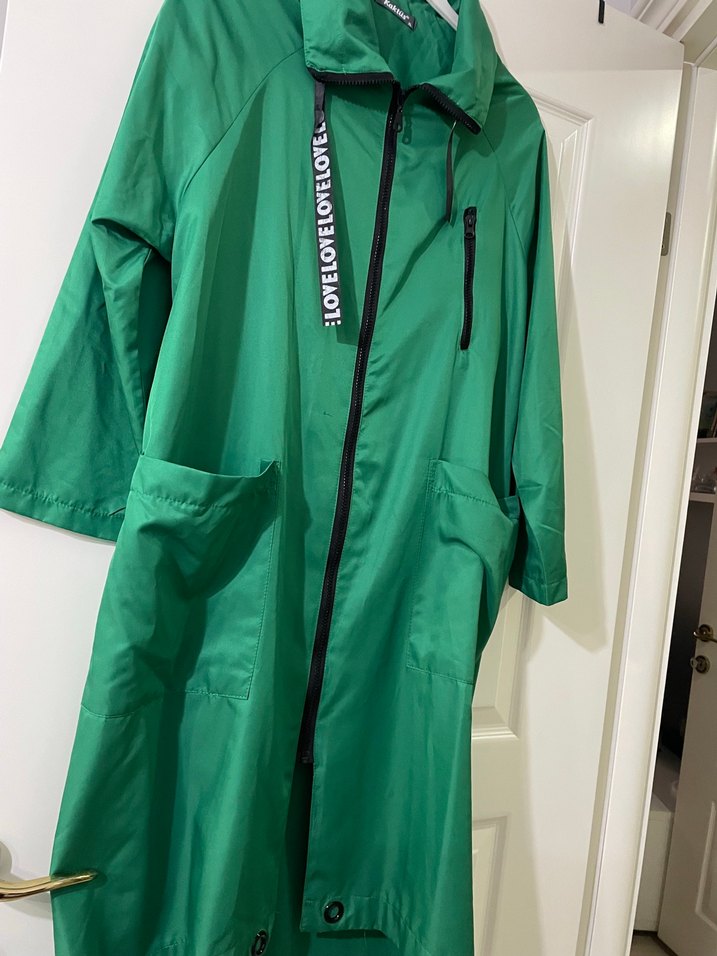 Bu uzun yeşil kadın yağmurluğu parlak görünümlü, fermuarlı, yüksek yakalı ve bol kesimdir. Sokak ve athleisure tarzına uygundur. ️
